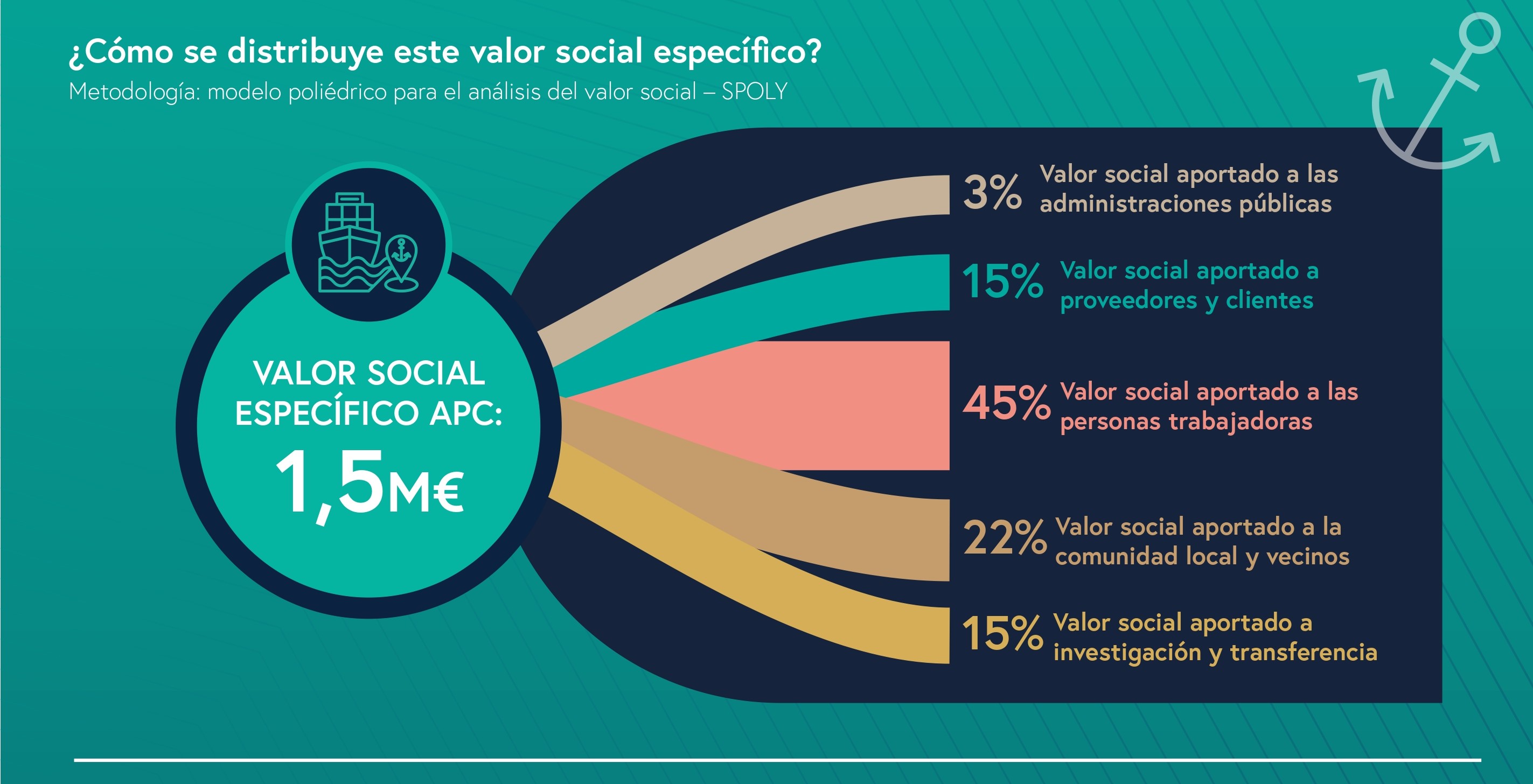 En relación con la distribución de valor socioemocional, junto con los más de 46 millones de euros transferidos a los clientes [46.019.558], destaca el aportado a la Administración Pública, que asciende a más de 28 millones [28.867.439] si se integran el retenido por la APC con el distribuido a otras administraciones. Otras cantidades significativas son los 10.248.889 € netos, aportados a las personas trabajadoras; los 4.421.555 de euros de valor agregado traccionados con los proveedores; los 480.989 € aportados a la comunidad local y vecinos y los 527.199 € destinados a investigación y trasferencia.